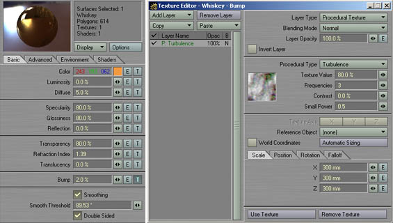 Above you can see the details of the whiskey surface, including the Base Tab and the bump texture.